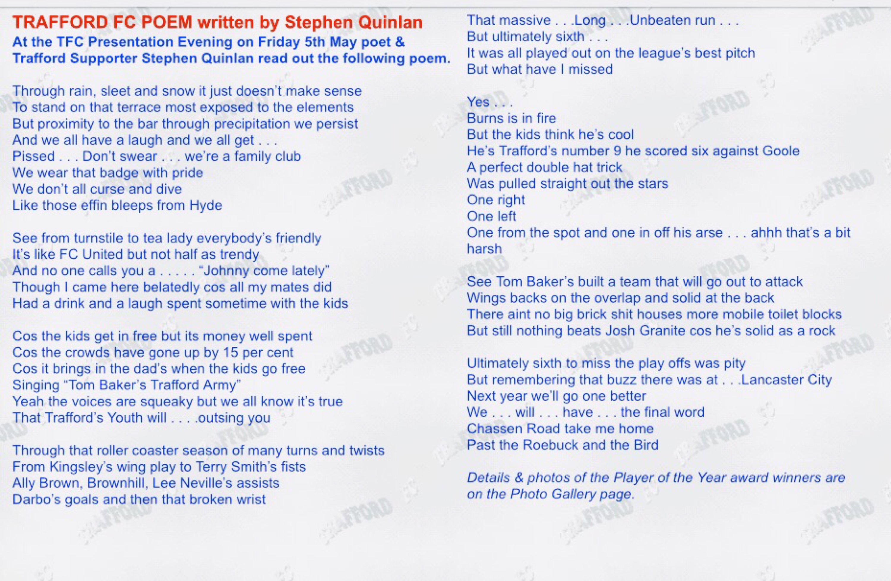 Was honoured to be asked to perform a spoken word piece at Trafford FC’s awards do. Broke the cardinal rule of mixing the mutually exclusive concepts of football and poetry…